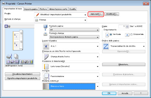 In questa sezione è descritta la procedura per la registrazione delle impostazioni per la stampa di quattro pagine su un solo foglio (4 in 1) e per la selezione del profilo registrato per l'esecuzione della stampa.