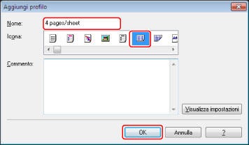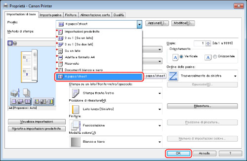 Dall'elenco a comparsa [Profilo], selezionare [4 pages/sheet] → fare clic su [OK].