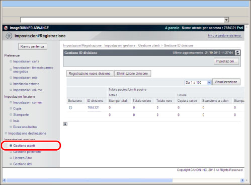 Le impostazioni di Gestione ID divisione sono uguali a quelle cui è possibile accedere dal pannello comandi premendo [Gestione utenti] → [Impostazioni/Registrazione] → [Gestione ID divisione]. Per istruzioni sull'utilizzo del pannello comandi per specificare le impostazioni di Gestione ID divisione e per ulteriori informazioni su Gestione ID divisione, vedere "Gestione ID divisione".