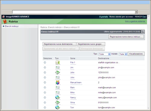 Le operazioni di gestione della rubrica disponibili mediante l'IU remota sono uguali a quelle ottenute con la selezione della schermata [Impostazione destinazione] (Impostazioni/Registrazione) nel pannello comandi.