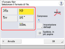 Se l'invio viene effettuato nel formato PDF, XPS o OOXML è possibile selezionare ulteriori impostazioni. Per istruzioni sull'impostazione di ciascun tipo di PDF, XPS o OOXML, fare riferimento a quanto segue: