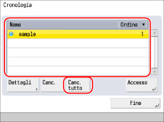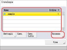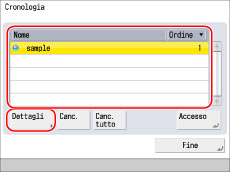Impostando [ID div/Uten con cronol.] su 'On' in Impostazioni, vengono visualizzati anche l'ID divisione o il nome utente. (Vedere "Impostazioni relative a informativa e normativa sulla privacy".)