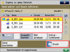 Sie können bis zu sechs Dateien gleichzeitig in einem Ordner wählen und drucken lassen. Sie können aber keine Dateien mit unterschiedlichen Dateiformaten zum gleichen Zeitpunkt auswählen.