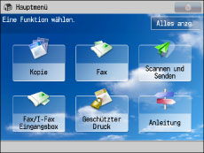 Wenn Sie die Taste [Alles anzg.] auf dem Hauptmenüdisplay berühren, werden alle Tasten in der Standardreihenfolge angezeigt, auch wenn Sie die Anordnung der Tasten geändert haben. Berühren Sie die Taste [Alles anzg.] erneut, um zu Ihrer angepassten Anzeige zurückzukehren.