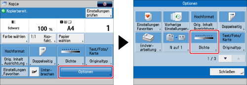 Wenn Sie die Hintergrunddichte durch Drücken von [Justieren] für <Hintergrunddichte> justieren möchten, wird die Einstellung [Auto] aufgehoben. Entsprechend werden beim Drücken von [Auto] beim Vornehmen manueller Einstellungen in [Justieren] Ihre Einstellungen aufgehoben. Das System justiert automatisch die Dichte entsprechend dem Hintergrund.