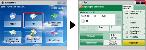 Es werden vier Optionen-Kürzel auf der Anzeige für Grundeigenschaften des Faxens angezeigt. [Dichte], [Originaltyp], [Doppelseitig. Original] und [Vorschau] sind die Standardwerte. Diese Kürzel können mit Funktionen belegt werden, die Sie häufig verwenden.