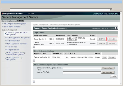 Sie können Default Authentication (Verwaltung per Abteilungs ID), den aktuell verwendeten Login Service (den Login Service, dessen Status als <Stop after Restart> angezeigt wird) sowie den Login Service, den Sie beim nächsten Start des Systems verwenden werden (den Login Service, dessen Status als <Start after Restart> angezeigt wird), nicht deinstallieren.