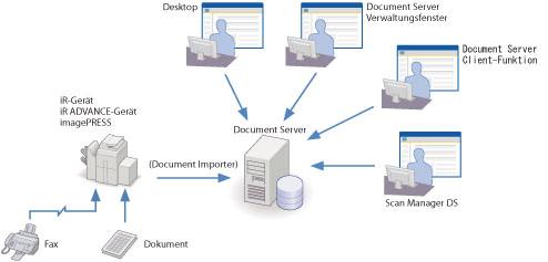Der iW Document Server ist ein Dokumentenverwaltungsserver, der die iW Document Server-Clientfunktion oder den iW Desktop als Client verwendet. Neben der Dokumenterstellung mit diesen Clients ist Document Server in der Lage, Dokumente, die mit Multifunktionsgeräten der Serie iR oder Dokumentenscannern der Serie DR gescannt wurden, über das Netzwerk zu speichern. Dies ermöglicht den Aufbau eines funktionalen Systems für eine effiziente Verwaltung gespeicherter Dokumente.