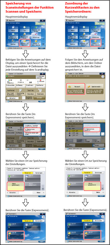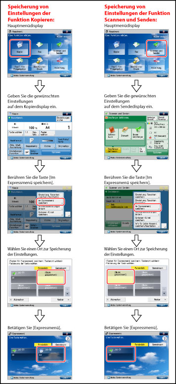 Eine Anleitung zum Speichern einer persönlichen/gemeinsamen Taste finden Sie am Beispiel der Funktion Scannen und Senden im Abschnitt "Speichern von persönlichen/gemeinsamen Tasten".