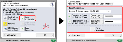 Wenn Sie [Passwort erforderl., um Zul. zu ändern] aktivieren, können die verschlüsselten PDF-Dateien nur nach Eingabe des Passworts ausgedruckt und bearbeitet werden.