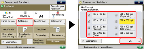Berühren Sie die Taste [Auflösung] → Wählen Sie die gewünschte Auflösung → Bestätigen Sie durch Berühren der Taste [OK].