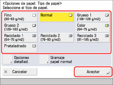 Si el tipo de papel que ha cargado no figura en la lista de la pantalla de opciones simples, puede guardarlo en la lista de tipos de papel. Para los detalles acerca de los tipos de papel, consulte "Guardar/editar tipos de papel personalizados".