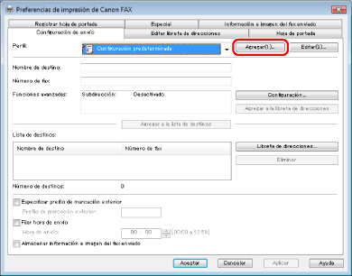 Para editar o eliminar un perfil, haga clic en [Editar] a la derecha de [Perfil] en la ficha [Configuración de envío], [Hoja de portada] o [Especial].