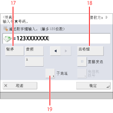 按下可以在正在拨打的传真号码中插入几秒钟暂停。如果在号码之间按[暂停],则会在号码之间出现字母<p>。如果在号码末尾按[暂停],则会在号码末尾出现字母<P>。拨国外号码时,在国家代码后及该电话号码末尾插入暂停。(请参阅“暂停时间”)