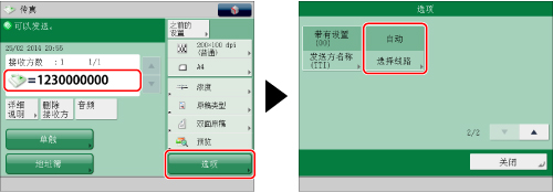 如果选择[自动],为用于发送的线路注册的电话号码和名称打印在接收方纸张上。这些信息也可能显示在接收方机器的触摸面板显示屏幕上。