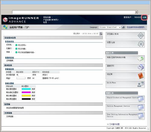 对于普通用户,“设置/注册”屏幕上的某些项目可能会受到限制。触摸面板显示屏幕上用户没有操作权限的项目变灰且无法选择。“远程用户界面”上不显示用户没有操作权限的项目。