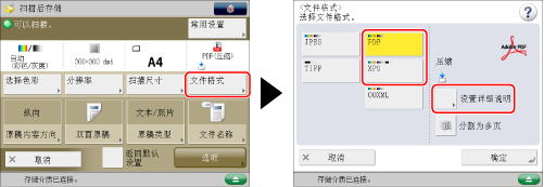 如果为PDF或XPS文件格式选择[压缩],则色彩模式分别从[自动(彩色/黑白)]和[黑白二值]转换为[自动(彩色/灰度)]和[灰度]。如果要以指定的色彩模式扫描文档,将PDF或XPS文件格式更改为除[压缩]和[轮廓]以外的任何格式。