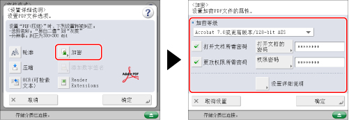 选择此按键设置用于打印或编辑已扫描PDF的密码。如果选择该键,则可以指定如<允许打印>、<允许更改>和[启用图像/文本的可访问性、复制和提取]的设置。