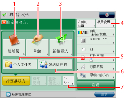 如果在[限制新接收方]中将某个地址类型设置为“打开”,则不能输入该类型的新接收方。使用[地址簿]中的“本地地址簿”、“远程地址簿”、“LDAP服务器”或按[单触]中的单触按钮选择一个已存储的接收方。(请参阅“限制发送到新地址”)
