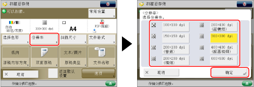 可以指定用于扫描原稿的分辨率。以高质量扫描会增加文件尺寸,但可以确保在最终图像中保留详细信息。