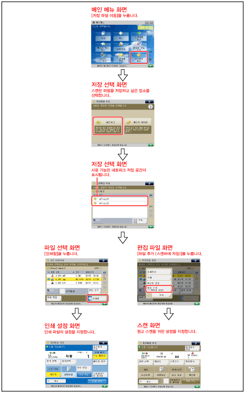 [파일 추가 (스캔하여 저장)]와 과련된 절차 및 스캔 화면에서 조작에 대한 사항은 "파일 추가(스캔하여 저장)" 및 "스캔하여 저장 조작 순서."를 참고하십시오.