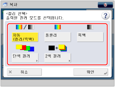 [복사의 컬러 선택 설정]의 [자동(컬러/흑백) 사용함]을 '해제'로 설정한 경우 [자동 (컬러/흑백)]이 표시되지 않습니다. (See "자동 컬러 선택 사용 제한.")