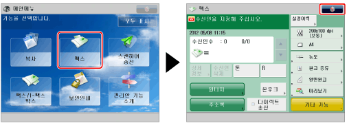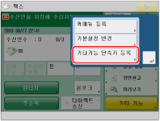 네 가지 기타 기능 단축키가 팩스 기본 기능 화면에 표시됩니다. [농도], [원고 종류], [양면원고] 및 [미리보기]가 기본값으로 표시됩니다. 이러한 단축키를 자주 사용하는 기능으로 변경할 수 있습니다.
