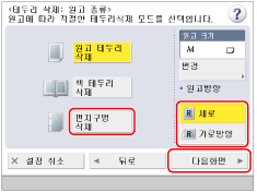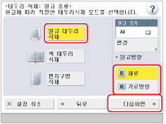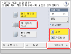 터치 패널 화면에 나타나는 원고 용지 크기에 대한 책 테두리 삭제 모드만 설정할 수 있습니다.
