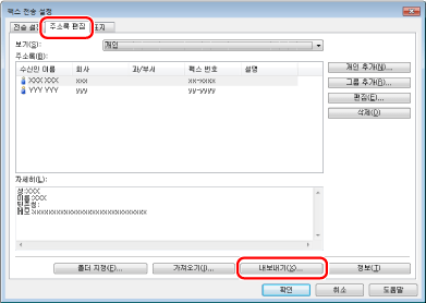 [특수] 탭의 [보안 설정] 대화상자에서 [주소 목록을 내보낼 때 암호로 보호]를 선택한 경우 [내보내기]를 클릭하면 암호 입력 대화상자가 표시됩니다. 자세한 내용은 도움말을 참고하십시오("도움말 보기" 참고).