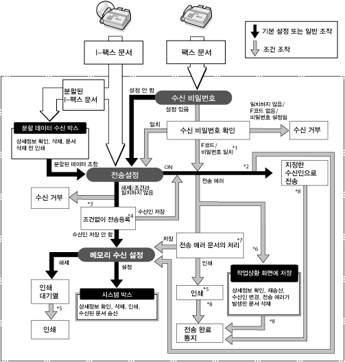*2 [전송설정]에서 <수신 파일의 저장/인쇄>를 '설정'으로 지정한 경우 전송된 파일이 시스템 박스에 인쇄 또는 저장됩니다. 수신 파일의 저장/인쇄에 대한 자세한 내용은