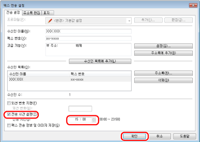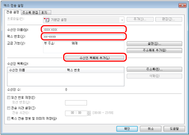 [특수] 탭의 [보안 설정] 대화상자에서 [수신인을 [수신인 목록]에 추가하기 전에 팩스 번호 다시 입력하기]를 선택한 경우 [수신인 목록에 추가]를 클릭하면 [수신인 확인] 대화상자가 표시됩니다. 자세한 내용은 도움말을 참고하십시오("도움말 보기" 참고).