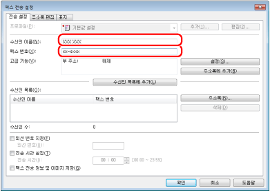 [특수] 탭의 [보안 설정] 대화상자에서 [대상을 [대상 목록]에 추가하기 전에 팩스 번호를 다시 입력]을 선택한 경우, [대상 목록에 추가]를 클릭하면 [암호 확인] 대화상자가 표시됩니다. 자세한 내용은 도움말을 참고하십시오("도움말 보기" 참고).