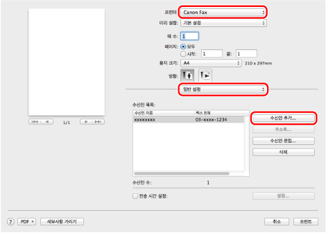 팩스를 선택하고 → [일반 설정]을 클릭한 후 → [수신인 추가]를 클릭합니다.