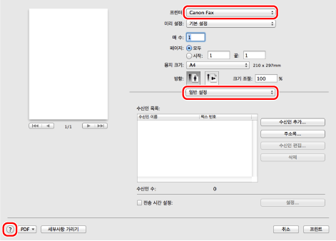 [프린터]에서 팩스를 선택하고 → 환경 설정 창을 선택한 후 → [