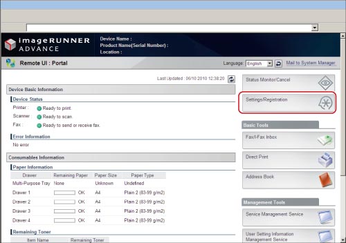 (설정/등록) → [관리 설정] → [라이센스/기타]를 누르고 → [리모트 UI]를 '설정'으로 지정합니다.|