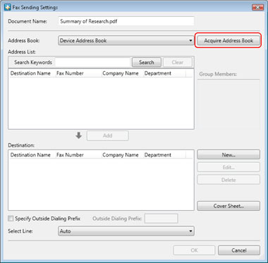 [Fax Sending Settings] 대화 상자에서 표지를 구성할 수 있습니다. 자세한 내용은 "참고 정보"를 참고하십시오.