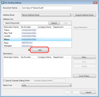 imageRUNNER ADVANCE의 주소록에 등록되지 않은 주소를 [Destination]에 추가할 수도 있습니다. 자세한 내용은 "참고 정보"를 참고하십시오.
