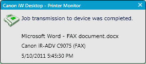 Windows 스풀러가 스풀링 실행을 시작하고 imageRUNNER ADVANCE로 팩스 송신 작업을 완료하기까지 기간 중에 표시됩니다.