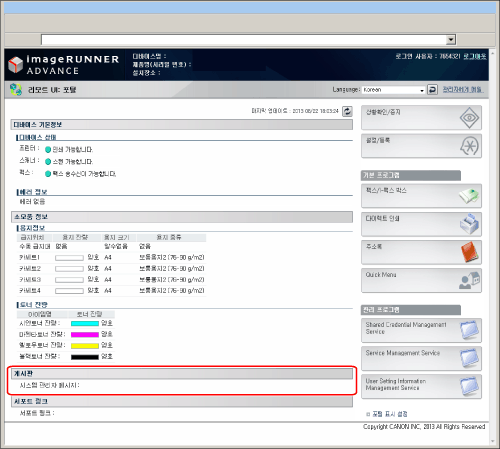 [포털에 표시]를 선택할 경우 게시판은 리모트 UI 의 포탈 페이지에 표시됩니다.