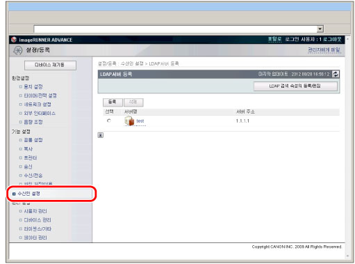 (설정/등록) → [수신인 설정] → [LDAP서버 등록]을 눌러 기기의 조작 패널에서 액세스할 수 있는 설정과 동일합니다. 조작 패널을 사용한 LDAP 설정 지정에 대한 자세한 내용은 "LDAP 서버 설정."을 참고하십시오.LDAP 서버 설정을 지정하려면 관리자로 로그인해야 합니다.