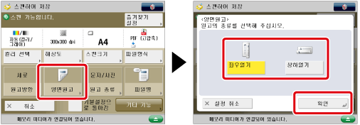 세로로 세트된 원고를 양면 원고로 스캔하려면 [원고방향]에서 [세로]를 선택하십시오. (See "원고 이미지 방향 지정하기.")