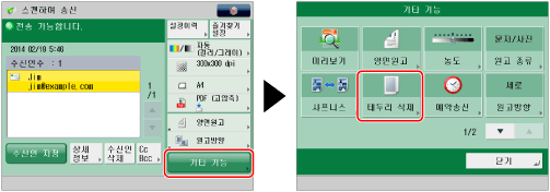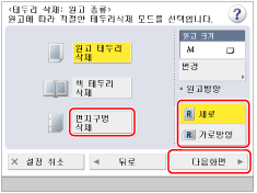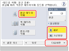 터치 패널 화면에 나타나는 원고 용지 크기에 대한 책 테두리 삭제 모드만 설정할 수 있습니다.