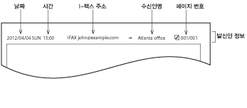 기록 용지의 맨 위에 송신 기록이 인쇄되도록 기기를 설정했으며 일부 항목만 등록된 경우 등록된 항목 및 총 원고 페이지 수만 인쇄됩니다.