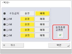[용지종류 고려함]을 '설정'으로 지정하면 다른 용지 공급원에 동일한 크기와 종류의 용지가 들어 있지 않은 경우 용지 공급원의 용지가 부족해도 다른 용지 공급원에서 용지를 급지하지 않습니다. 저장된 용지 종류에 대한 자세한 내용은 "소모품 상황 및 기타 정보 확인."을 참고하십시오.