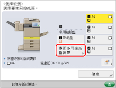 若有多項預約工作等待列印,則在「選擇紙張」螢幕上只顯示最後一次為預約列印工作指定的紙張尺寸/類型。