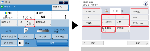 若設定[自動],則必須手動選擇紙張尺寸。若沒有選擇紙張尺寸,會自動根據紙匣1中添加的紙張尺寸設定適當的影印倍率。