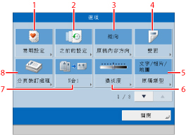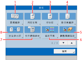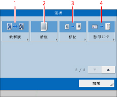 顯示後一螢幕或前一螢幕。這些螢幕顯示所有特殊影印模式。