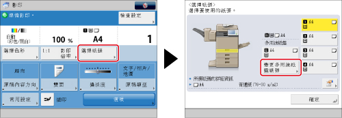 請務必將與步驟4中所選尺寸和類型相同的紙張添加至多用途紙盤。若添加了不同尺寸或類型的紙張,則無法開始影印。