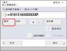 根據電話系統,暫停的位置和實際暫停時間可能不同。請聯絡當地的授權Canon經銷商或者當地電話公司諮詢詳細資訊。