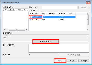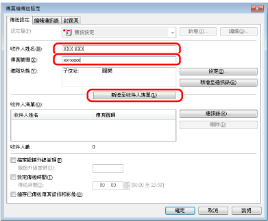 如果您在[特殊選項]頁的[安全設定]對話方塊中選擇了[將收件人新增至 [收件人清單] 前,請先重新輸入傳真號碼],那麼按下[新增至收件人清單]時會顯示[確認密碼]對話方塊。有關詳細資訊,請參閱說明(請參閱「檢視說明」)。
